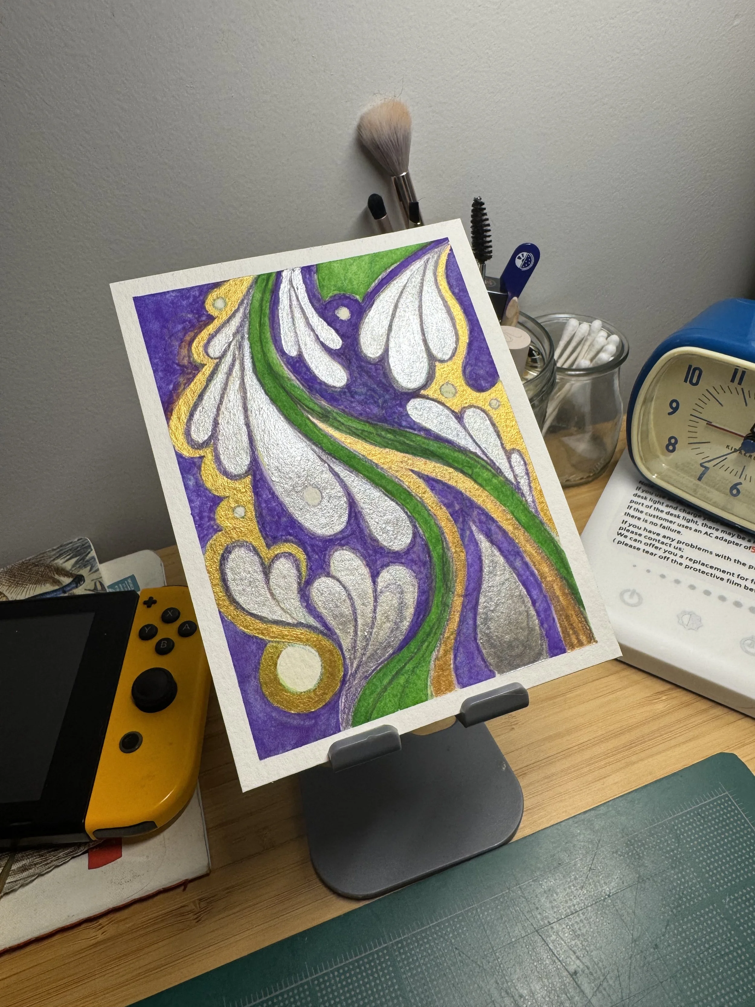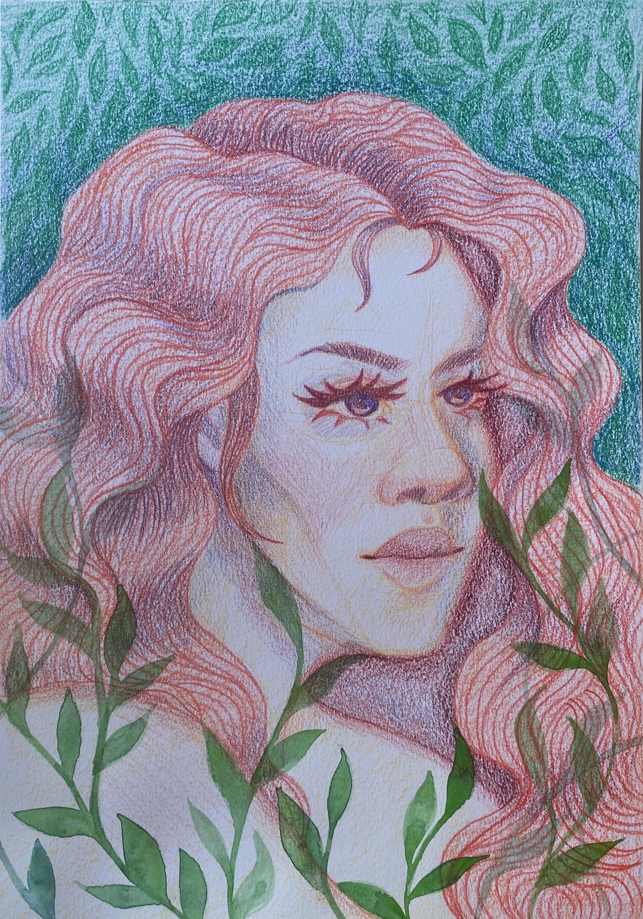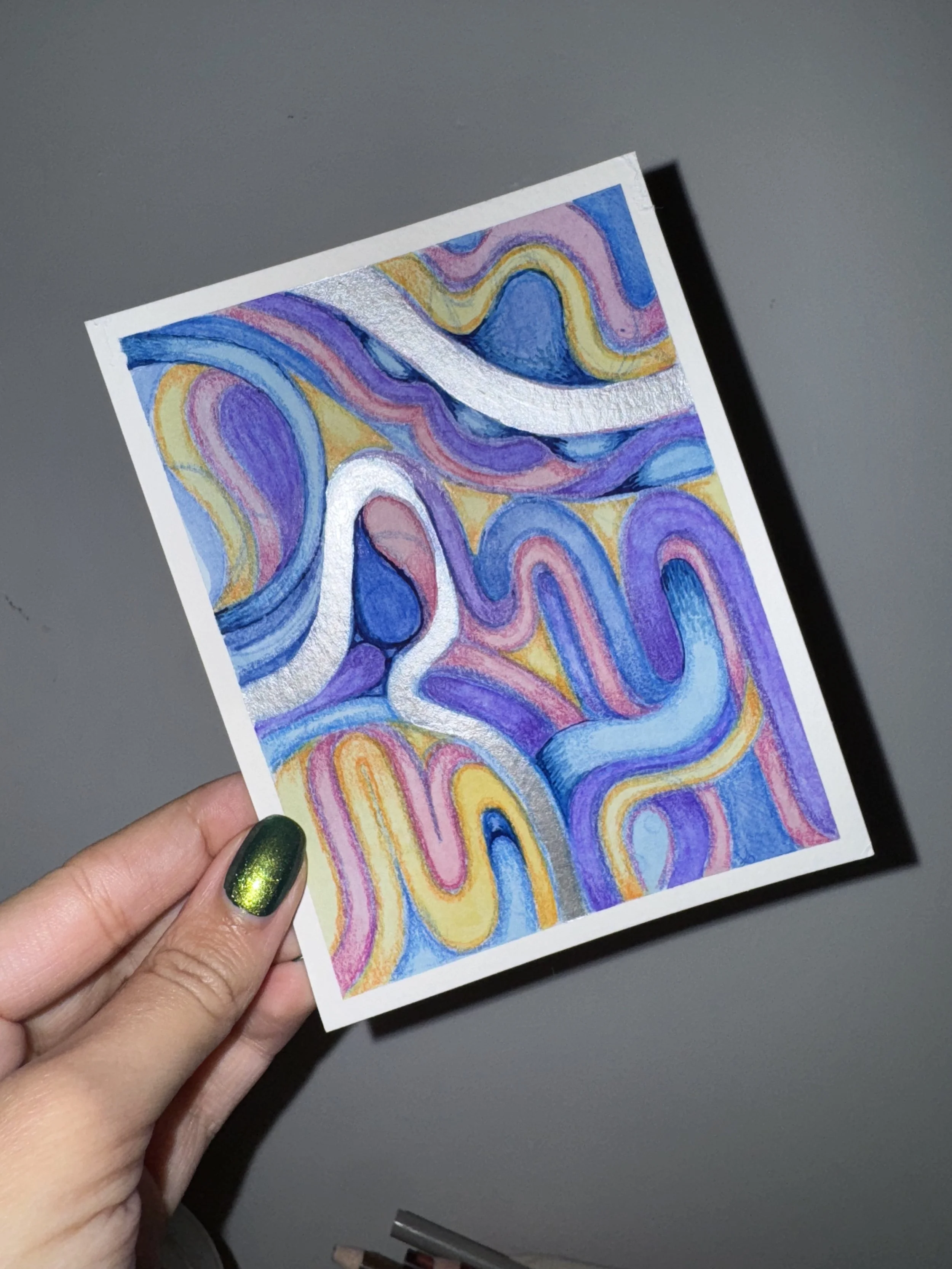 In recent times I’ve been focusing on abstract compositions created through layers of dividing up the page, done intuitively in colored pencil and water color. I’ve also deeply enjoyed portraiture over the years.